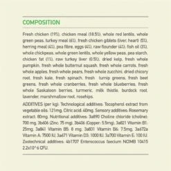 SamenstellingVerse gefileerde kip (16%)*, Gedroogd kippenvlees (15%), Gedroogd kalkoenvlees (14%), Rode linzen, Hele groene erwten, Vers kippen orgaanvlees (lever, hart en nier)(4%)*, Gedroogde haring (4%), Erwtenvezels, Verse hele eieren (4%)*, Verse gefileerde platvis (3%)*, Haring olie (1%), Zongedroogde alfalfa, Veldbonen, Groene linzen, Hele gele erwten, Kippenvet (1%), Vers kippenkraakbeen (1%)*, Gedroogd bruin zeewier, Verse hele pompoen*, Verse hele muskaat pompoen*, Verse hele pastinaak*, Verse boerenkool*, Verse spinazie*, Verse mosterdplant blad*, Verse raapstelen*, Verse hele wortelen*, Verse Red Delicious appels*, Verse Barlett peren*, Gevriesdroogde kippenlever, Gevriesdroogde kalkoenlever, Verse hele veenbessen*, Verse hele blauwe bessen*, Cichoreiwortel, Kurkuma, Mariadistel, Kliswortel, Lavendel, Heemstwortel, Rozenbottels.*= ingrediënten VERS aan de bereiding toegevoegd