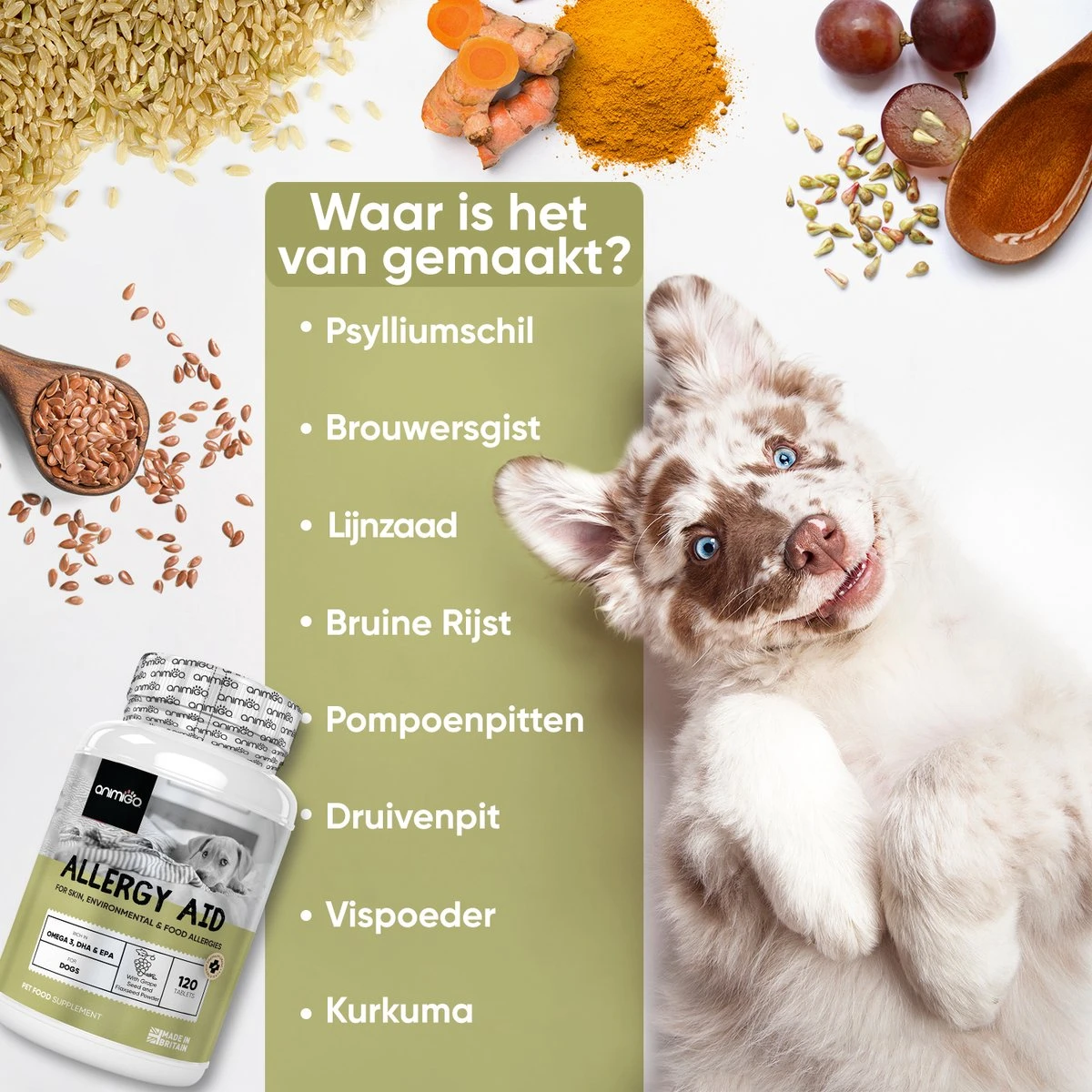 Net als mensen kunnen honden allergisch zijn. Dit Animigo anti allergie supplement helpt bij een huid-, milieu- of voedselallergie bij je hond. Deze natuurlijke tabletten ondersteunen een sterk immuunsysteem om een allergische reactie en de gevolgen hiervan zoals jeuk op de staart, rug of poten te voorkomen.