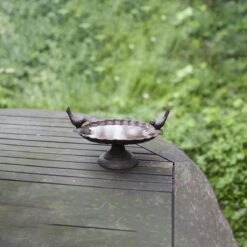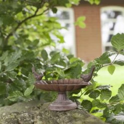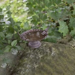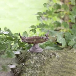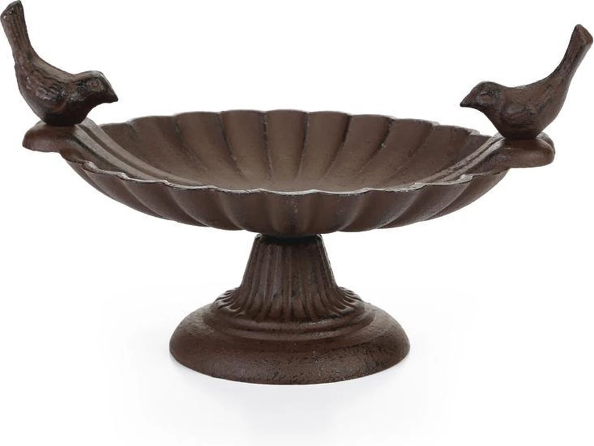 Vogelbad op voet met decoratieve vogels. Antiek roestbruin. Ook dieren hebben in de warme zomerdagen behoefte aan verkoeling! Plaats deze antiek roestbruine schaal in de buurt van uw raam of terras zodat u nog eenvoudiger van de badende vogels kunt genieten.
