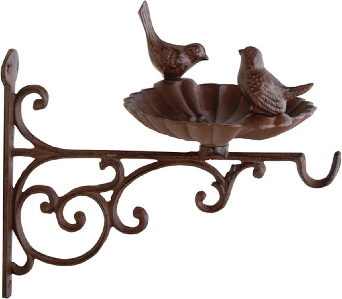 Vogeldrinkschaal op sierlijk gekrulde wandhaak met decoratieve vogels. Aan de haak zelf kunt u een ander vogel voederartikel ophangen ofwel een hanging basket. Antiek roestbruin. Hang deze antiek roestbruine schaal met haak in de buurt van uw raam of terras zodat u nog eenvoudiger van de badende vogels kunt genieten.