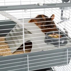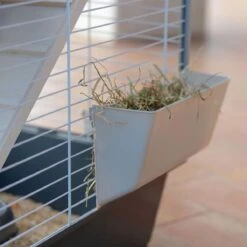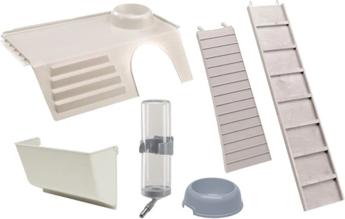 Deze konijnenkooi wordt ook geleverd met handige accessoires zoals een voederbak voor hooi, twee drinkflessen, twee voerbakken, twee ladders, een plank en een huis om te ontspannen, allemaal belangrijke benodigheden voor het grote plezier van je kleine vriend.