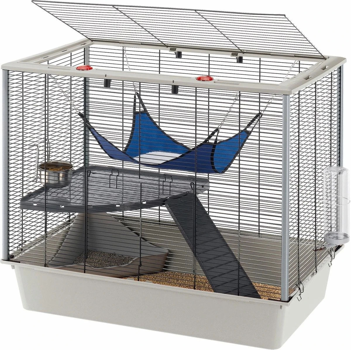 Deze kooi bevat alles wat je fret nodig heeft. De bovenkant van de kooi is gemaakt van metalen tralies. De onderkant is gemaakt van kunststof zodat de bodembedekking niet snel uit de kooi kan vallen. De bovenkant is afneembaar zodat je het hok makkelijk en snel kunt schoonmaken. Aan de bovenkant zit een dakje dat je open kan maken, dit dak is beveiligd met een slotje.