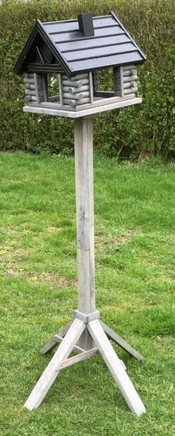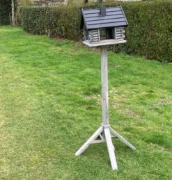 Mooi Groot Garden Spirit vogelvoederhuisje Grijs met een zwart dakje op een eenvoudig te monteren stabiele voet.