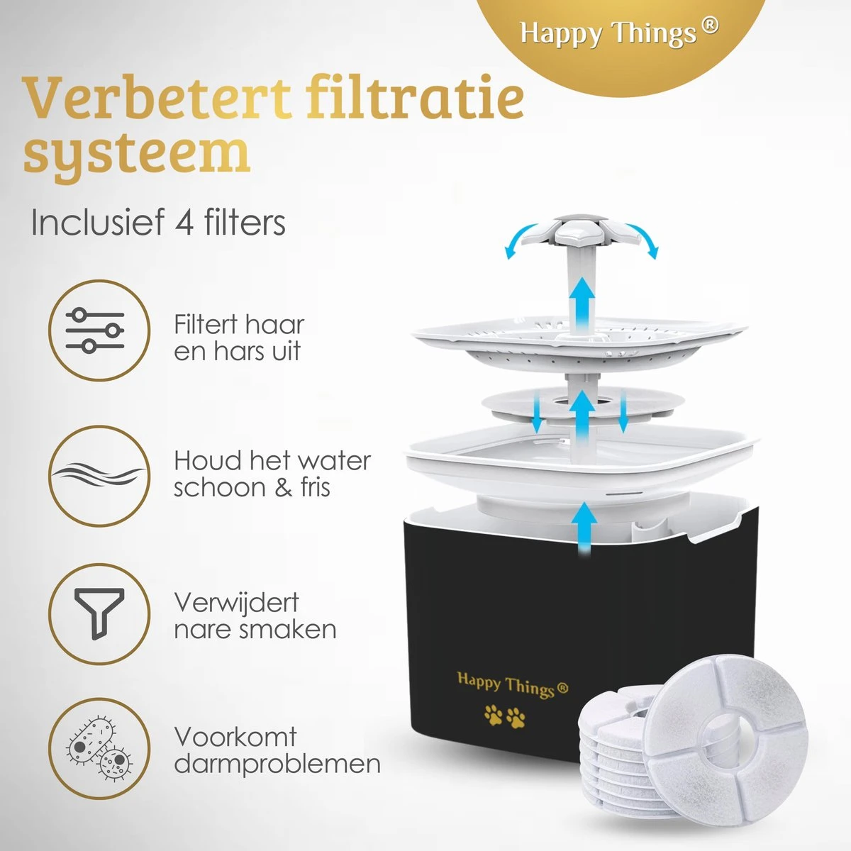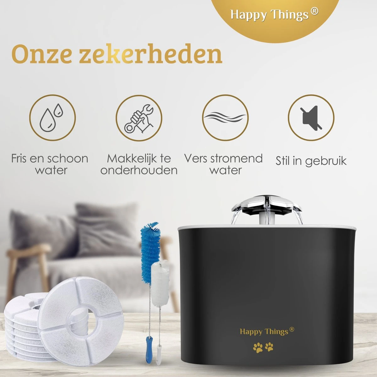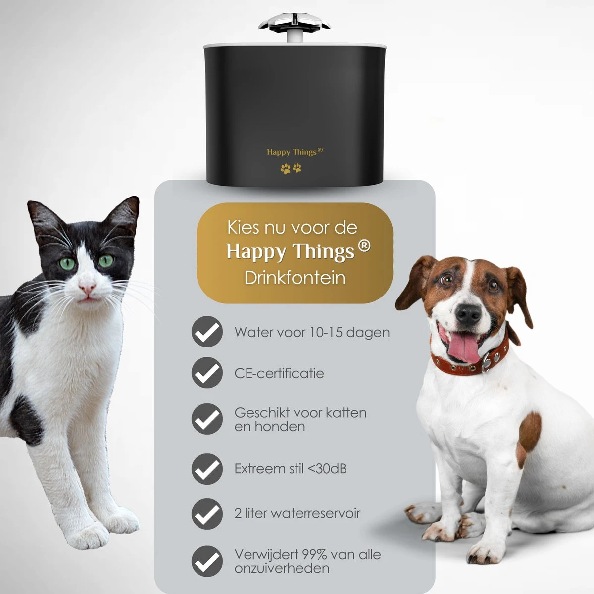 Gefilterd water is goed voor de gezondheid van jouw huisdier, want wie wilt nou niet het beste voor zijn of haar huisdier? Door de drinkfontein van Happy Things ben jij verzekerd van fris en gezuiverd water wat kalk en andere water onzuiverheden wegfiltert.