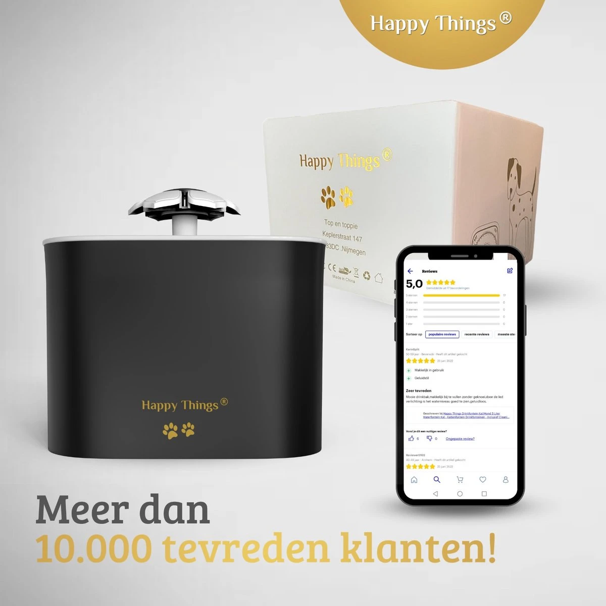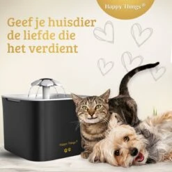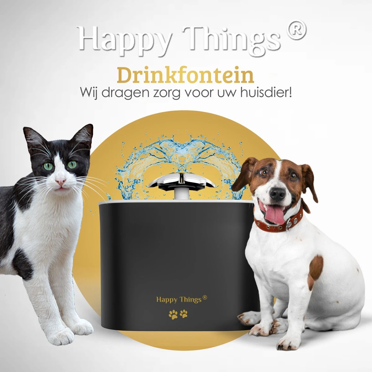 - Niet alle katten drinken graag uit een doorsnee waterbakje – er moet enigszins beweging in zitten, wil het koude water interessant zijn voor een veeleisende kat. De Happy Things drinkfontein is de ideale oplossing hiervoor.