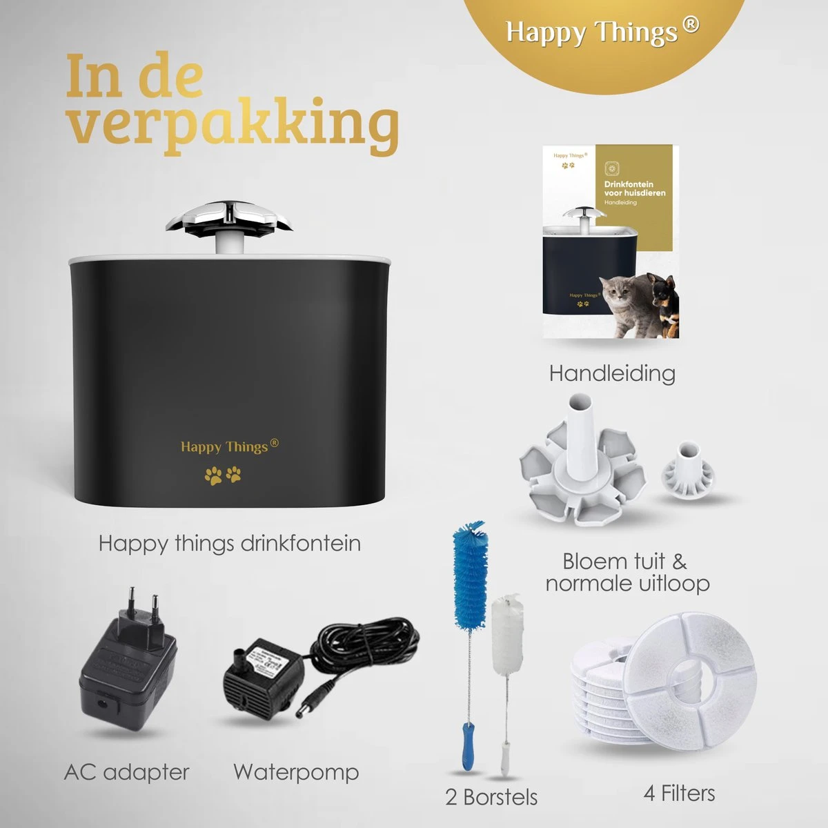 De Happy Things Drinkfontein heeft een prachtig design waardoor het een mooie toevoeging is aan de woonkamer of tuin/balkon. Door zijn strakke design (Zwart met Goud) past de waterfontein bij elk interieur. Verder is het doosje en logo bedrukt met gouden letters!