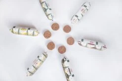 Onze heerlijke gestoomde, houdbare maaltijden zijn speciaal gemaakt voor honden die dol zijn op vlees (alle honden dus)! Het is een complete maaltijd bomvol vitaminen & mineralen. Ideaal als dagelijkse voeding, als afwisseling of als beloningsnack. Voor mensen die vers vlees geven is het ideaal voor vakantieperiodes of wanneer er vergeten is om vers vlees te ontdooien. Deze worsten zijn namelijk houdbaar buiten de vriezer! Ze zijn glutenvrij en bevatten geen kunstmatige geur-, kleur- en smaakstoffen. Ook zijn ze vrij van conserveringsmiddelen. Helemaal zonder fratsen dus. De maaltijden bestaan allemaal uit bijna 80% vlees, verrijkt met zilvervliesrijst, groenten en fruit. Er zitten geen andere diersoorten in, dan op de voorkant staat aangegeven.