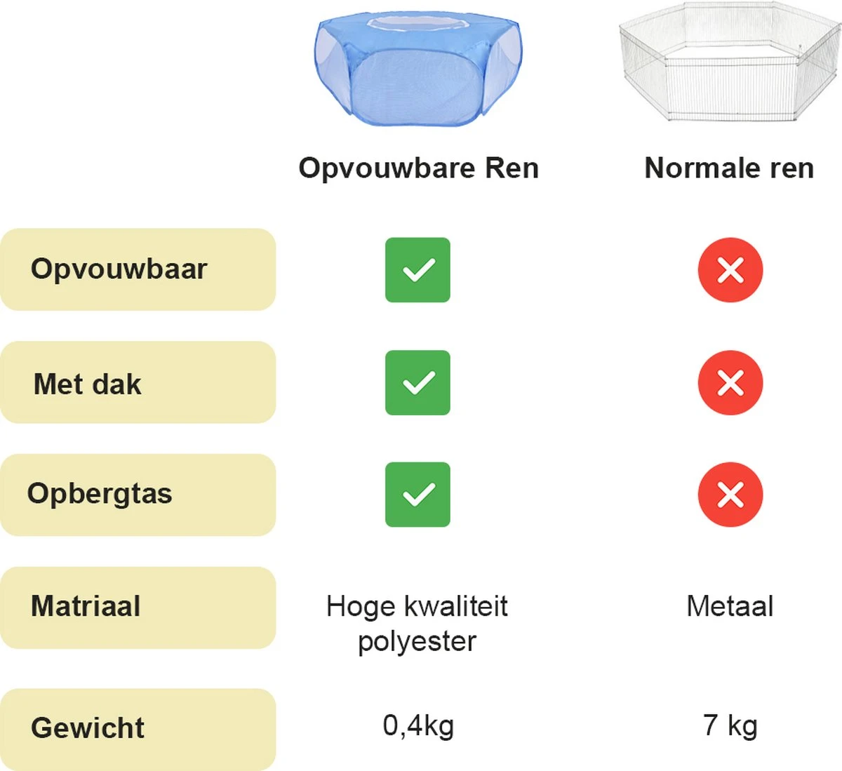 Ga jij een weekendje weg, maar wil je je huisdier meenemen en de ruimte geven? Deze ren weegt maar 400 gram, waardoor hij gemakkelijk is mee te nemen. Op de camping of ergens anders kunnen jouw dieren gewoon nog genieten van de omgeving en de buitenlucht.