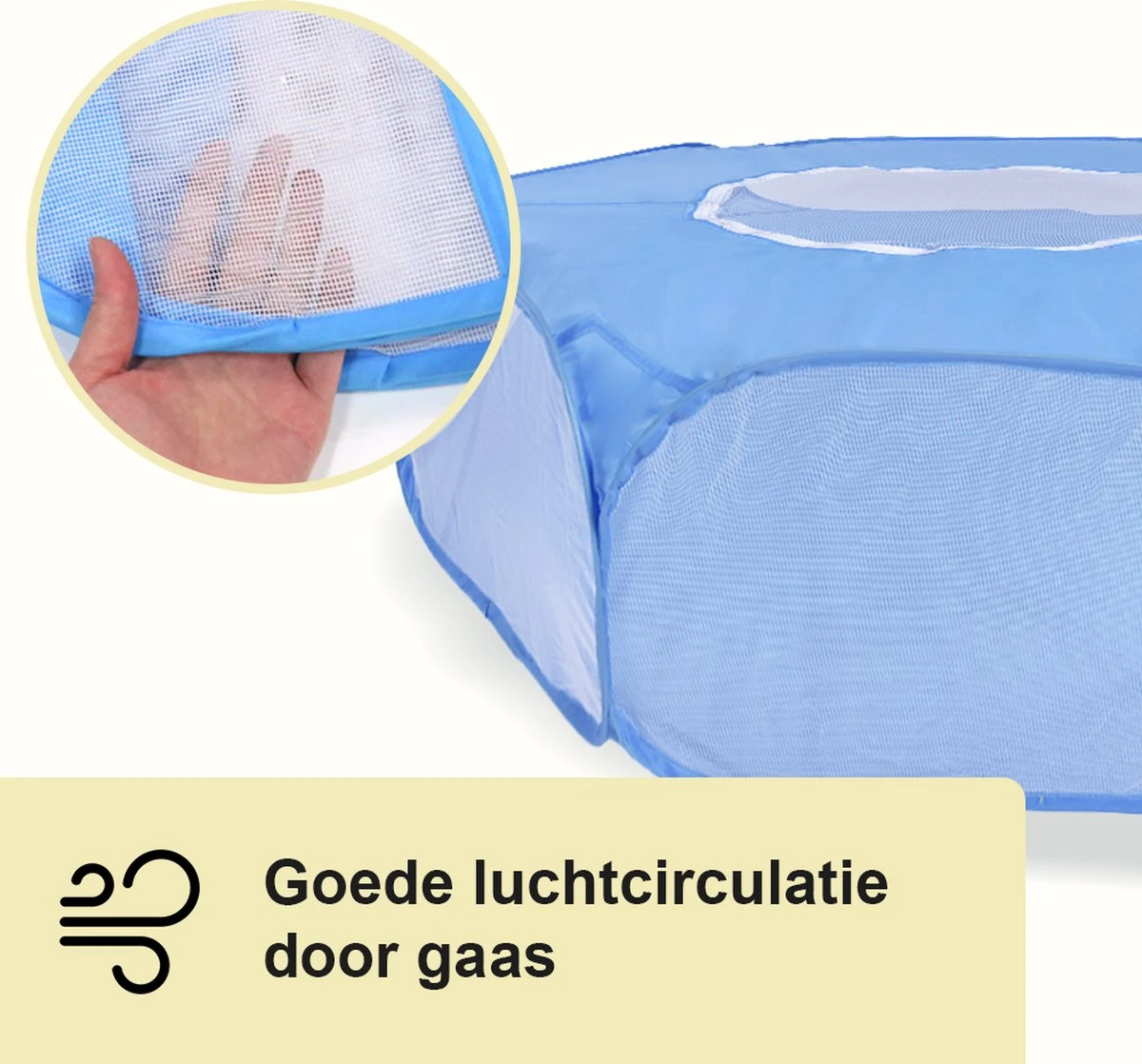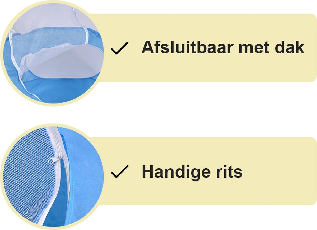 Een grote ren of kooi is vaak zwaar en kan niet altijd makkelijk opgeborgen of meegenomen worden. Deze blauwe ren is precies het tegenovergestelde. Door het soepele materiaal is de kooi binnen een seconde opgezet en kun je hem ook weer in enkele seconden opvouwen. Bespaar niet alleen je tijd, maar ook ruimte.