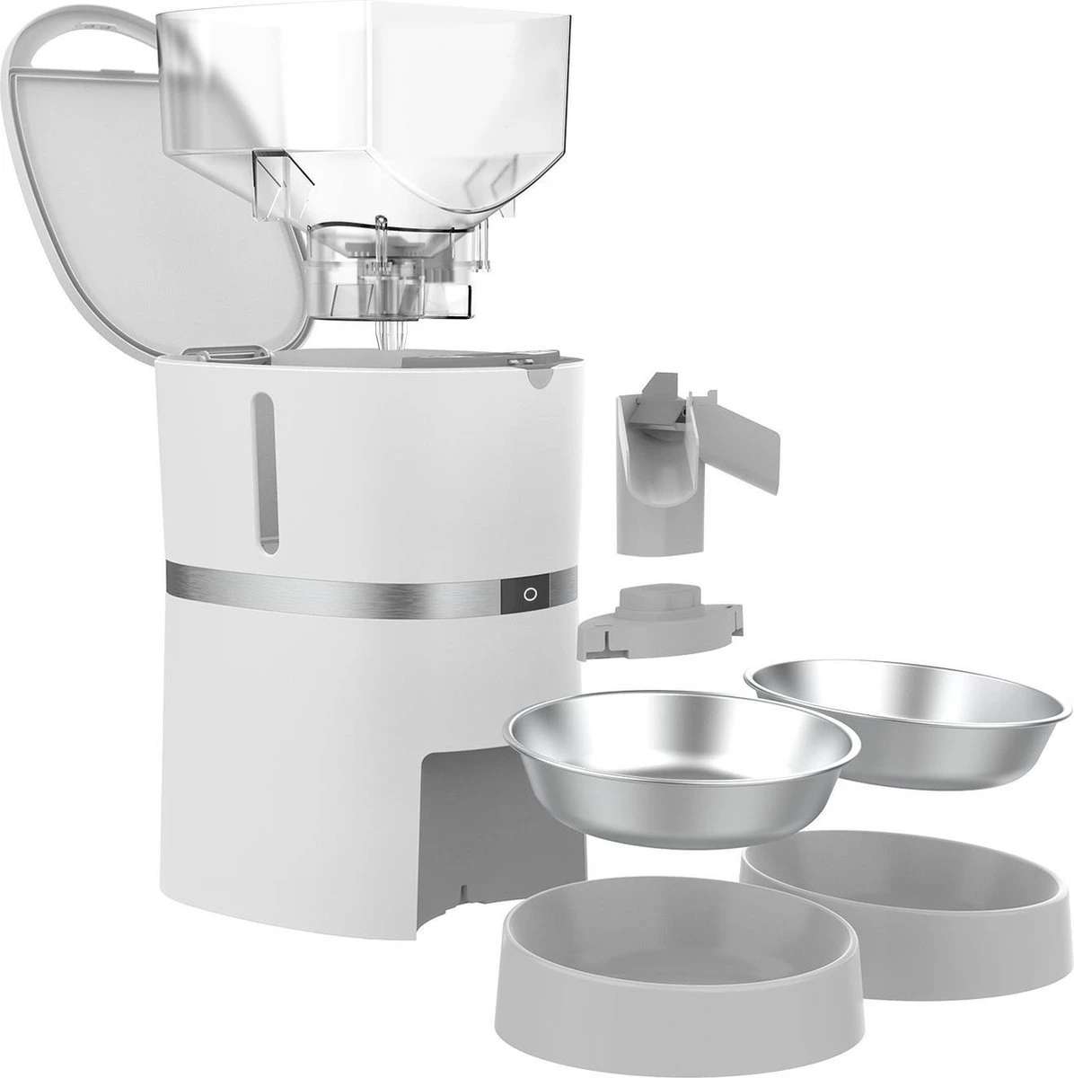 Deze automatische voerbak is zo ontworpen, dat je 1 of 2 voerbakjes kan gebruiken. Bij meerdere huisdieren kunnen 2 bakjes worden bevestigd en wordt het voer door het splitsysteem verdeeld.