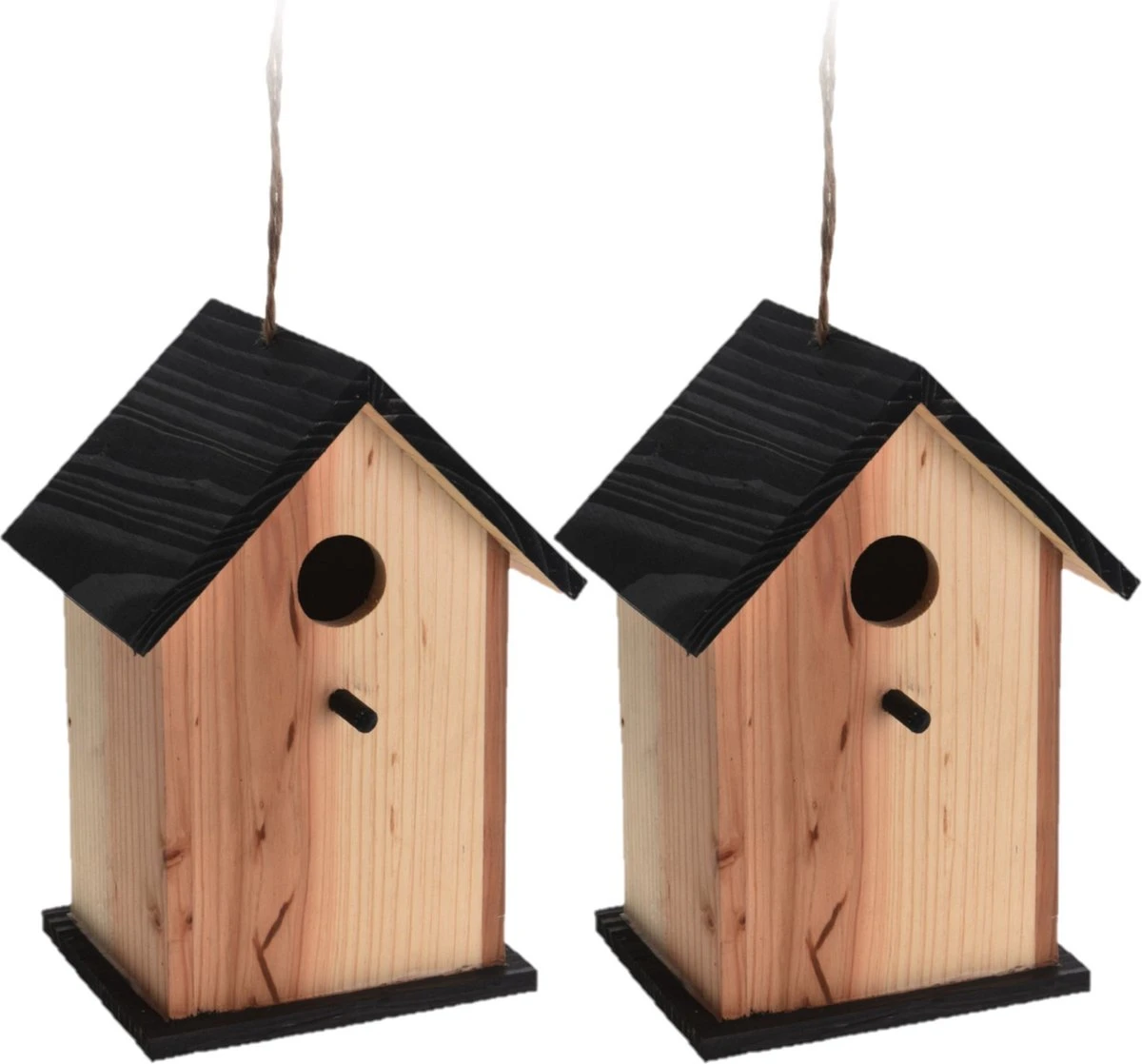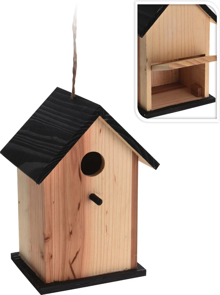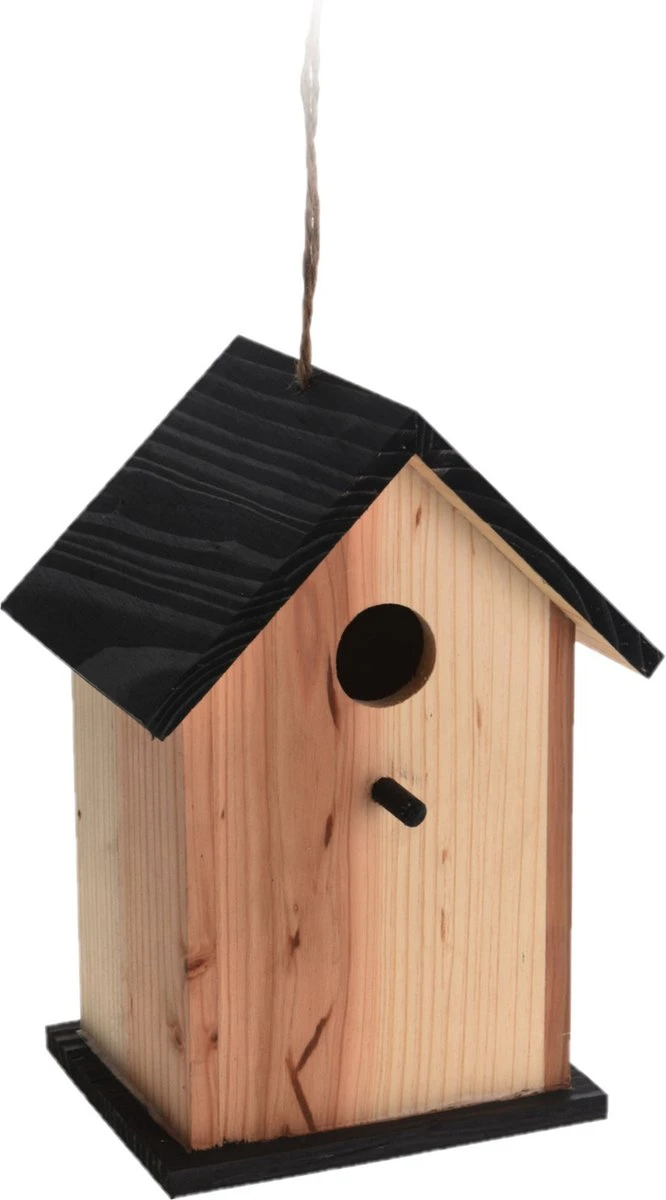 Vogelhuisje/nestkastje met dakje geschikt voor kleine vogels. Hang deze nestkast doormiddel van het touw gemakkelijk aan bijvoorbeeld een stevige tak van een boom. Nestkasten hebben ook in de winter een schuilfunctie en kunnen dus het jaar door blijven hangen. Aan de achterkant van het huisje zit een handig klepje om het huisje eenvoudig schoon te maken. Materiaal: hout. Afmeting: 16 x 13 x 22 cm. Kleur: zwart, naturel.