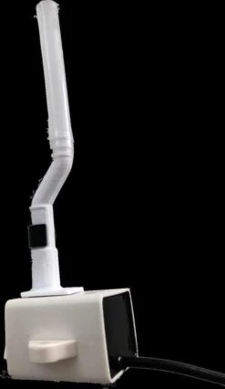 3.) Onder de hoogste toren bevindt zich meestal de pomp met witte verbindingsstuk en siliconen slang. Bevestig het witte verbindingsstuk op de pomp en zorg dat deze mooi aansluit. Bevestig vervolgens de siliconenslang aan het verbindingsstuk. Met het zwarte schuifje op het verbindingsstuk kan je de kracht van de uitstroom instellen. Steek de usb van de pomp door het gat vanuit de binnenkant van de grootste toren.