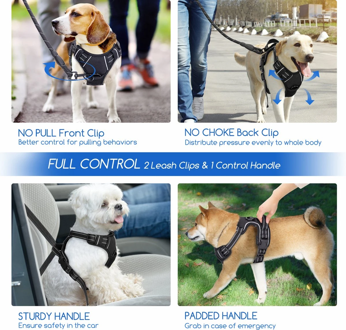 Neopreen gevoerde bedieningshendel en 2 ringen voor betere controle; 4 Afstel punten voor bijna aangepaste pasvorm; Snelle klikgespen voor gemakkelijk aan- en uittrekken; Zak voor ID-tag voor het plaatsen van ID-tags en zorgt ervoor dat uw huisdieren veilig thuiskomen.