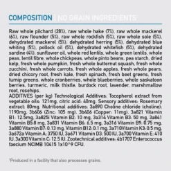 | Voedingswaarde | Verse hele sardine (25%), Verse hele Pacifische heek (9%), Verse hele Pacifische horsmakreel (8%), Verse Pacifische Pijltandheilbot (5%), Verse hele rock vis (5%), Verse hele Amerikaanse schol (5%), Hele makreel (gedroogd, 5%), Hele Haring (gedroogd, 5%), Hele blauwe wijting (gedroogd, 5%), Haring olie (5%), Pacifische kabeljauw (gedroogd, 5%), Hele rode linzen, Hele groene linzen, Hele groene erwten, Zonnebloem olie (koud geperst), Hele sardine (gedroogd, 1.5%), Linzen vezel, Hele kikkererwten, Hele gele erwten, Hele kievitsbonen, Kabeljauw lever (gevriesdroogd), Gedroogde bruine zeewier, Verse pompoen, Verse muskuspompoen, Courgette, Pastinaak, Verse hele wortelen, Verse Red Delicious appels, Verse Bartlett peren, Verse cranberries, Verse bosbessen, Verse groene boerenkool, Verse spinazie, Rode bieten loof, Raapstelen, Cichoreiwortel, Kurkuma, Mariadistel, Kliswortel, Lavendel, Heemstwortel, Rozenbottels. |