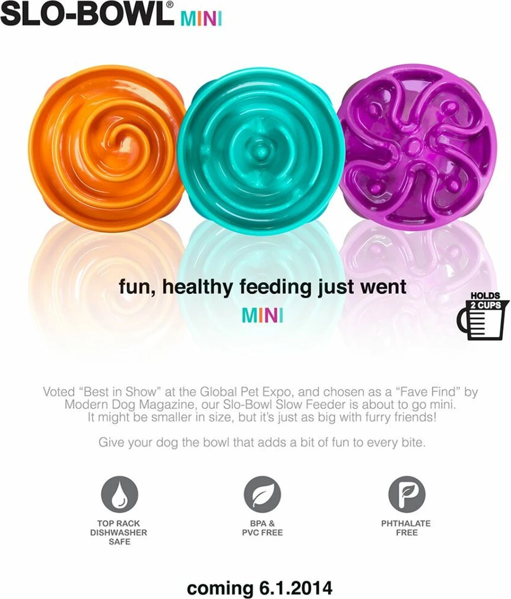 Als het tijd is om te eten, voer je hond dan met een gerust hart met de Slo Bowl voerbak. Hij is vrij van BPA-, PVC en ftalaat en is vaatwasmachinebestendig.