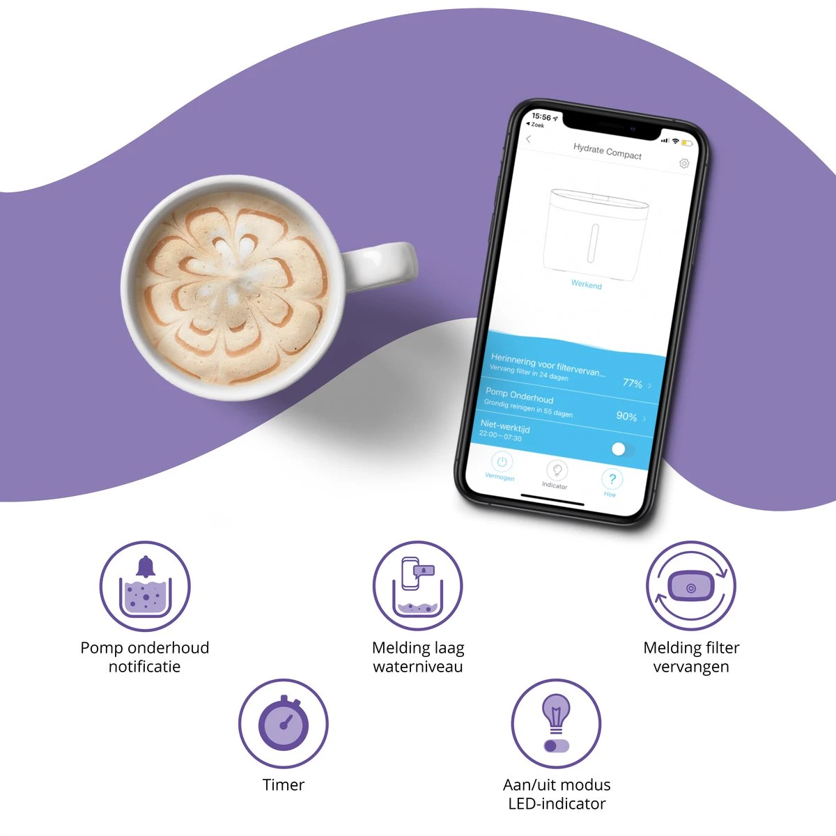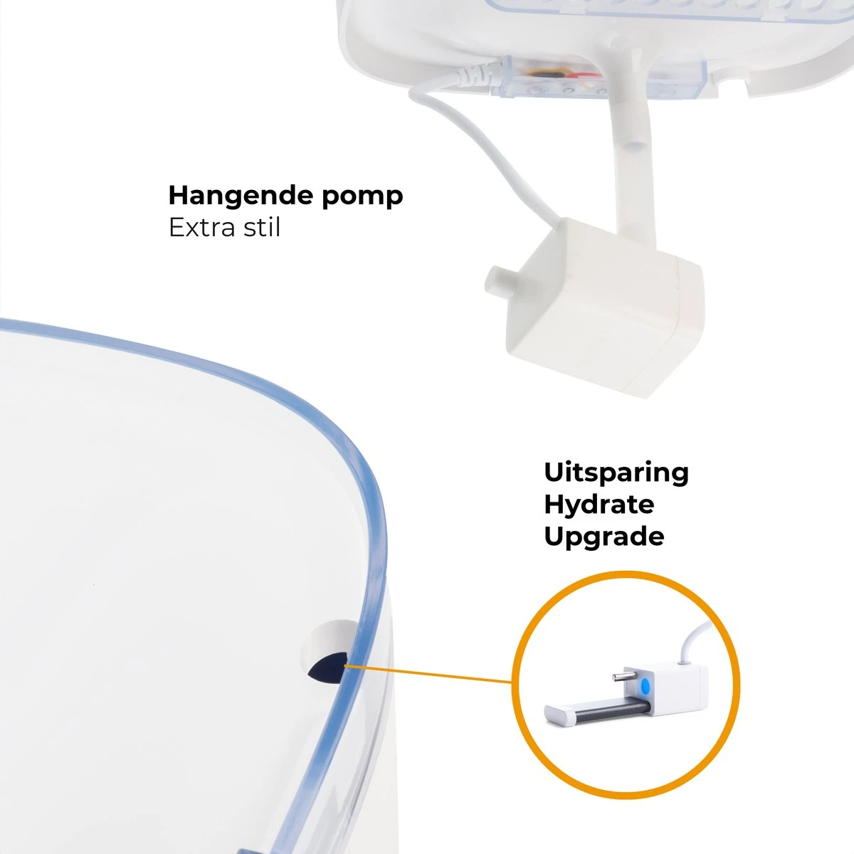 De smart drinkfontein Hydrate Compact van Pettadore is een slimme drinkfontein voor katten en honden. De waterfontein is verbonden met een app en heeft een waterreservoir van 1,9 liter. Het 4 filtersysteem en pomp houden het water schoon en zorgen voor veel zuurstof in het water. De kattenfontein heeft gedempt geluid en verbruikt weinig energie. De app weergeeft het waterniveau inclusief de werking en herinneringen van de smart drinkfontein!
