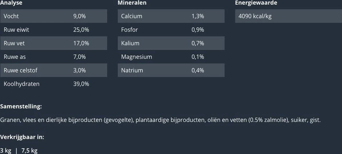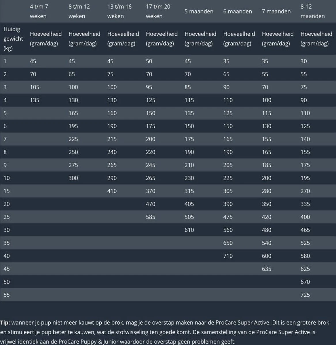 ProCare puppy & junior is bijzonder geschikt voor pups en jonge honden vanaf 4 weken tot een leeftijd van ca. 12 maanden. Daarna kun je overstappen op de ProCare super of ProCare STANDAARD-FIT. Meng gedurende minimaal 7 dagen steeds meer nieuwe voeding door de oude voeding tot u geheel bent overgestapt.