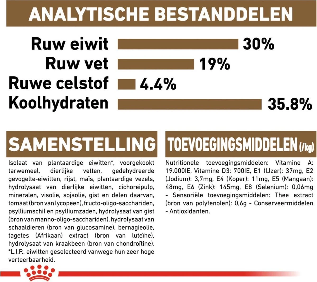 | Voedingswaarde | Samensteling: isolaat van plantaardige eiwitten*, voorgekookt tarwemeel, dierlijke vetten, rijst, maïs, plantaardige vezels, gedehydreerd gevogeltevlees, hydrolysaat van dierlijke eiwitten, cichoreipulp, mineralen, visolie, sojaolie, gist en delen daarvan, tomaat (bron van lycopeen), Fructo-Oligo-Sacchariden, psylliumschil en psylliumzaden, hydrolysaat van gist (bron van Manno-Oligo-Sacchariden), hydrolysaat van schaaldieren (bron van glucosamine), bernagieolie, tagetes (Afrikaan) extract (bron van luteïne), hydrolysaat van kraakbeen (bron van chondroïtine) |