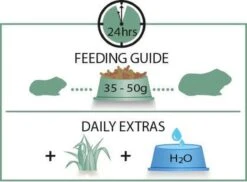 | Voedingsadvies | Afhankelijk van de grootte, het ras en de leeftijd van de cavia is een gemiddelde dagelijkse portie voeder van 35 tot 50 g aangewezen. Ververs elke dag zowel voeder als drinkwater. Voorzie ook ruimschoots hooi. |