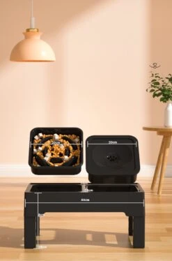 Hondenvoerbak in hoogte verstelbaar tot een maximale hoogte van 28 centimeter. Deze voerbak hond op standaard is voorzien van een slowfeeder. Onze voerbak is dubbel. Zo heeft uw hond een drink- en eet gedeelte. Als u op zoek bent naar een gezonde wijze voor uw hond’s eet- en drinkgewoonten, dan is de combinatie van onze slow feeder (1.4L) en drinkbak met drijvende plaat (1.6L) de perfecte keuze. We bieden deze combinatie in de kleuren zwart en grijs aan. Hierdoor kunt u een keuze maken die het beste bij uw eigen interieur past.