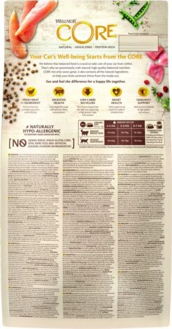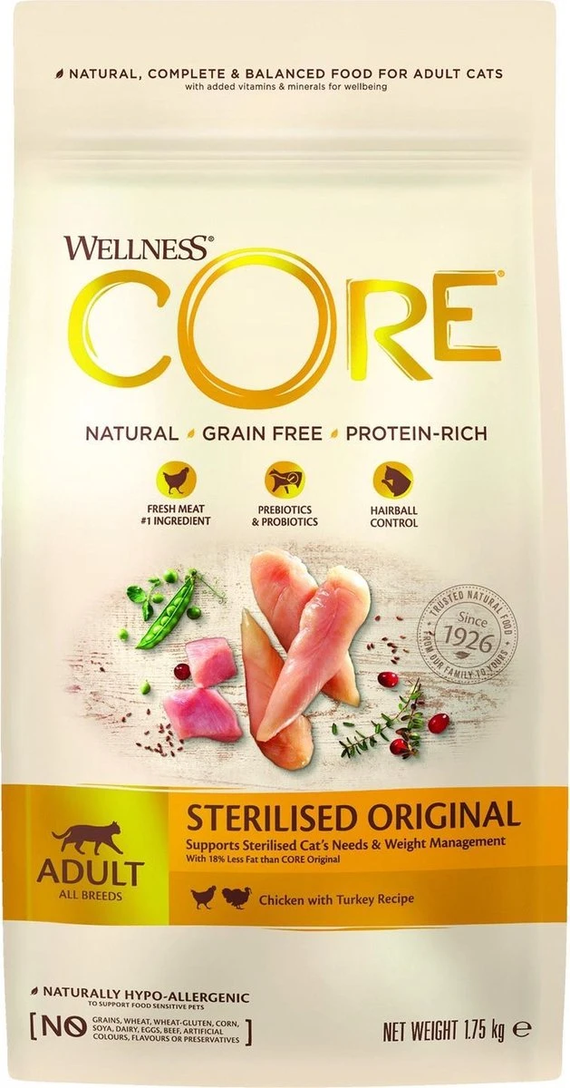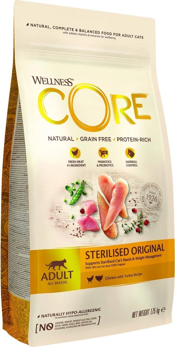 Wellness Core Grain free cat sterilised is kattenvoer dat natuurlijk, graanvrij en rijk aan proteïnen is. Daarnaast bevat het lekker vers vlees of verse vis als hoofdingrediënt! Elk recept van Wellness Core natuurlijk kattenvoer zit barstensvol dierlijke proteïnen van de hoogste kwaliteit, zoals verse kalkoen of zalm, zonder vulstoffen of granen, samen met een unieke mix van gezonde groenten, superfoods, kruiden en voedingssupplementen. Met 43% tot 58% eiwitrijke ingrediënten ondersteunen CORE recepten op een natuurlijke manier een gezonde energie en een magere spiermassa. Bekijk alle smaken en recepten van het assortiment en ontdek het perfecte recept voor jouw kat. Bij Wellness zijn ze ervan overtuigd dat welzijn begint met een gezonde voeding. Met hun recepten spreken ze de carnivoor in je kat aan, met een evenwichtig voer dat rijk is aan proteïnen. Voor Wellness producten gebruiken ze heel veel smaakvolle proteïnen van hoge kwaliteit en laten ze granen en vulstoffen weg. Zo dragen ze bij tot een optimale gezondheid, een goed gewicht en een lang en gelukkig leven. Met een ruime keuze aan volledig en uitgebalanceerd droog- en natvoer biedt Wellness CORE assortiment gezonde, natuurlijke recepten die beantwoorden aan de unieke voorkeuren van jouw kat op het vlak van smaak en textuur. Ontdek welk verschil CORE maakt: natuurlijke, graanvrije voeding rijk aan proteïnen!