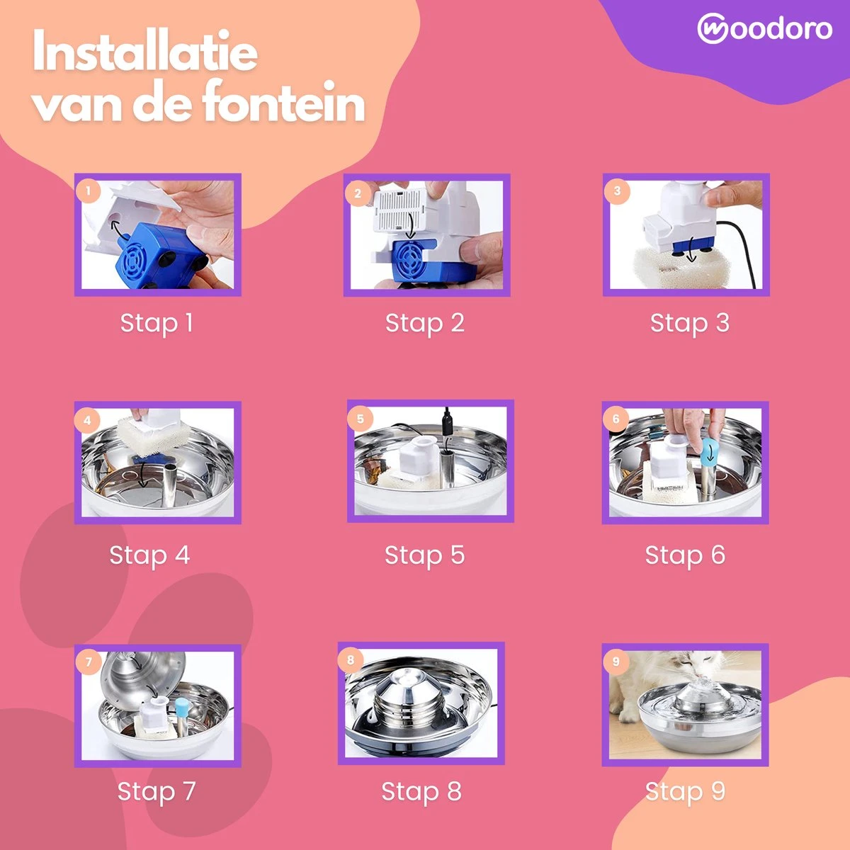 Onze drinkfontein bestaat uit antiallergisch roestvrij staal en is volledig vrij van BPA’s.